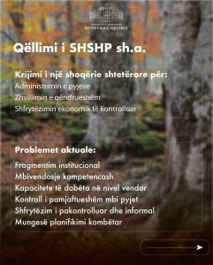 Është publikuar për konsultim projektligji për krijimin e Shoqërisë Shtetërore të Pyjeve SHSHP, si një ndërmarrje me kapital 100% shtetëror që do të marrë përgjegjësinë për administrimin, zhvillimin dhe shfrytëzimin e qëndrueshëm të pasurisë sonë pyjore